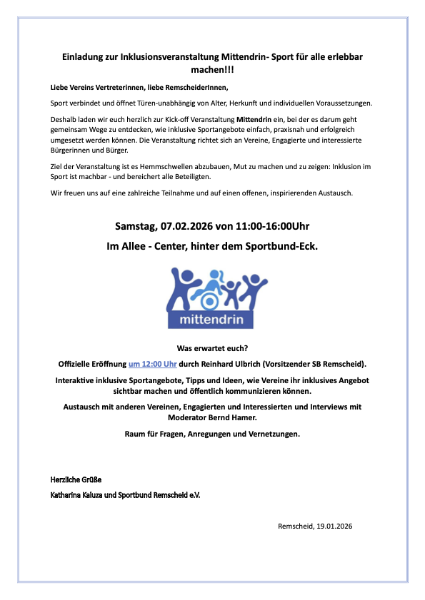 Unter diesem Motto findet Samstag, 7. Februar im Allee-Center Remscheid eine Inklusionsveranstaltung statt. Der RTB ist von 12 -14 Uhr vor Ort. Die Handicapsportgruppe, die Special-Hockeys und unser 1. Vorsitzender Florian Zwanzig werden den Verein vertreten, vorstellen und Fragen rund um den Handicapsport beantworten. Neben Interviews und Bühnenprogramm gibt es ebenfalls Mitmachangebote!