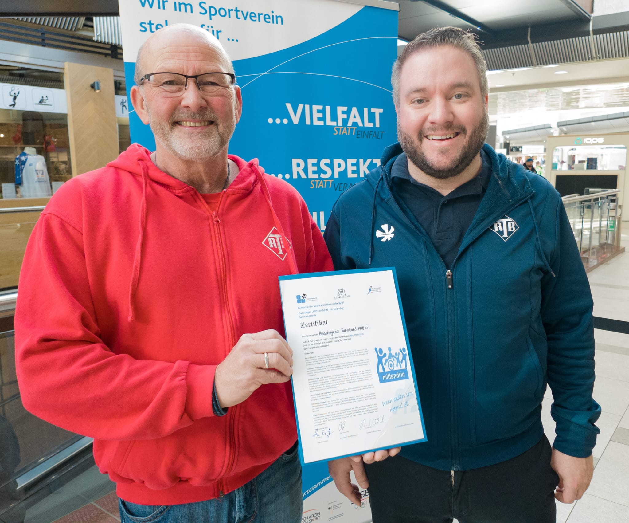 Im Rahmen des Projektes "MITTENDRIN", durchgeführt vom Inklusionsrat der Stadt Remscheid in Zusammenarbeit mit dem Sportbund Remscheid, wurde der RTB für seine hervorragende Arbeit im Handicapsport ausgezeichnet. Als erster Remscheider Verein erhielt er die Auszeichnung "Inklusionsverein". Der Verein bietet seit 17 Jahren Angebote für Menschen mit Handicap an. Der Verein ist offen für Neues und Besonderes, bietet Sport für Jeden und Jede an und denkt das Handicap bei Vereinsangeboten und Veranstaltungen mit. Unsere Handicapsportler und das Team der Special-Hockeys sind im Vereinsleben nicht nur dabei, sondern mittendrin.